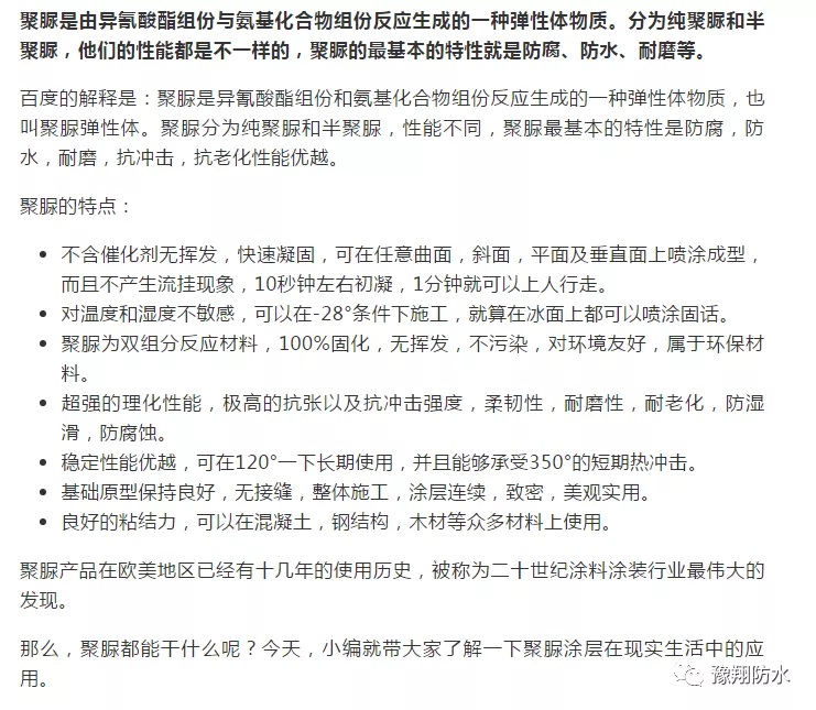 聚脲產(chǎn)品對大多數(shù)化工產(chǎn)品有免疫性能,耐酸堿,抗老化,大量使用與橋梁,橋墩,化工廠,污水池,大型油氣罐,管道等工程。